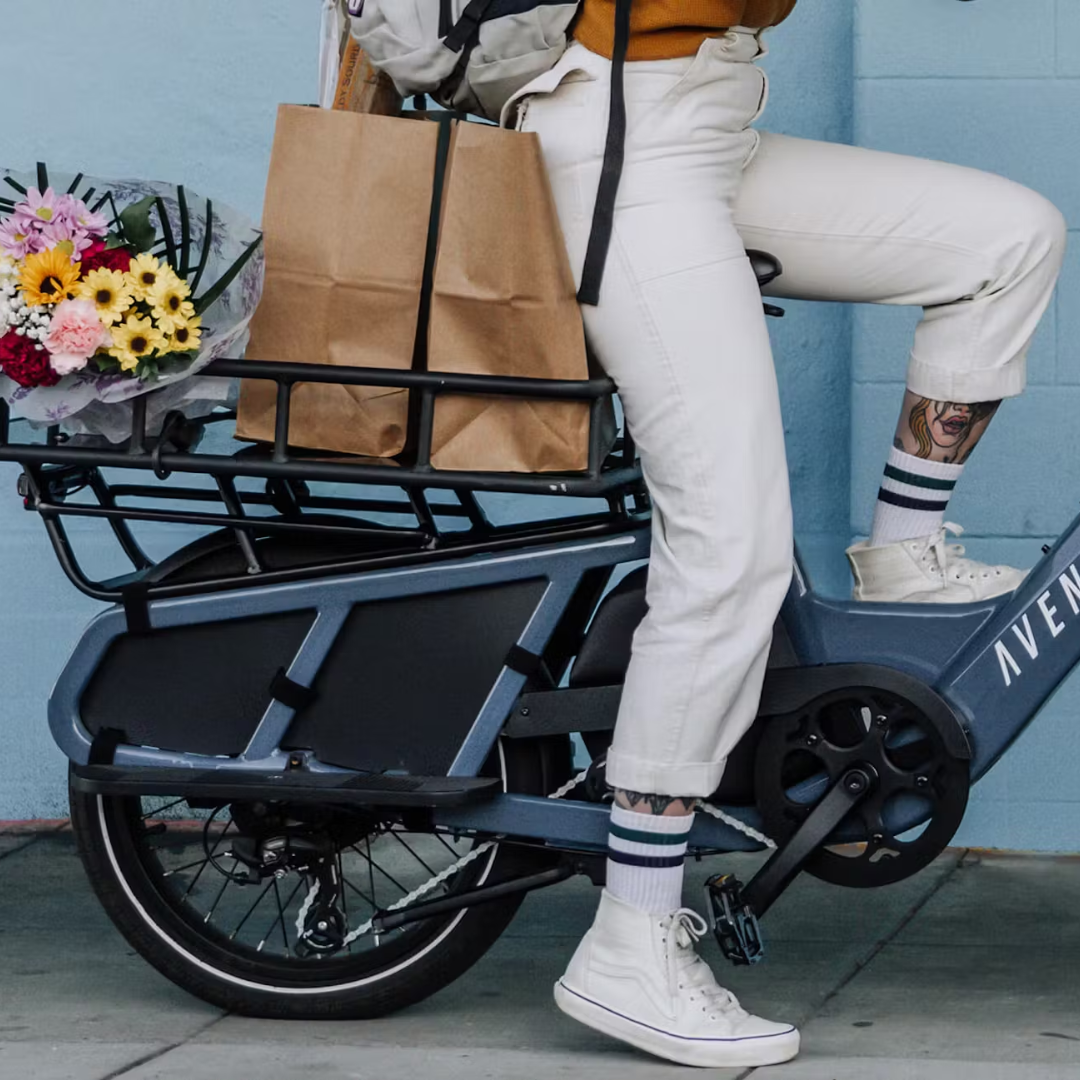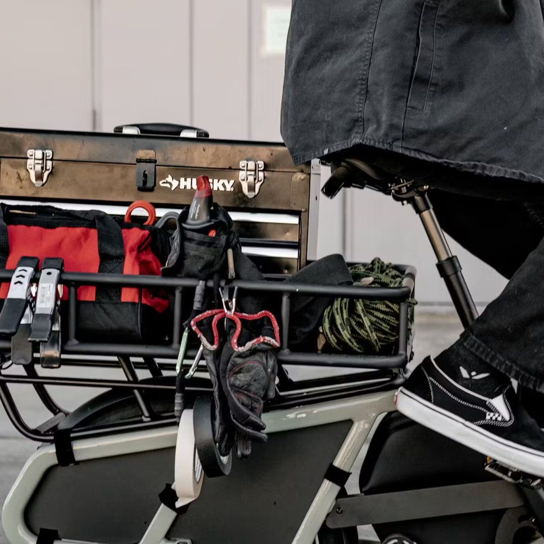 Aventon Rear Rack Basket – Abound turns your e-bike into a true cargo hauler. Built with a strong 6061 aluminum frame and an ABS platform tray, this heavy-duty basket can carry up to 143 lbs — perfect for groceries, deliveries, or hauling gear for work or play.