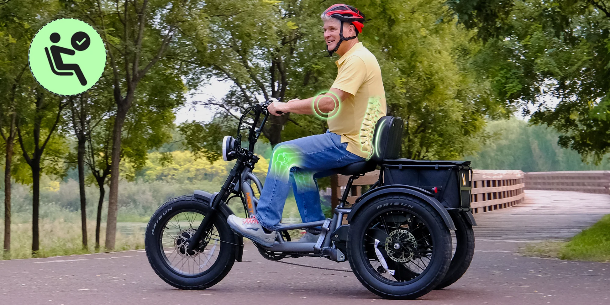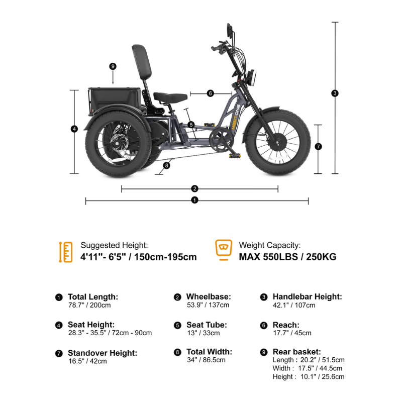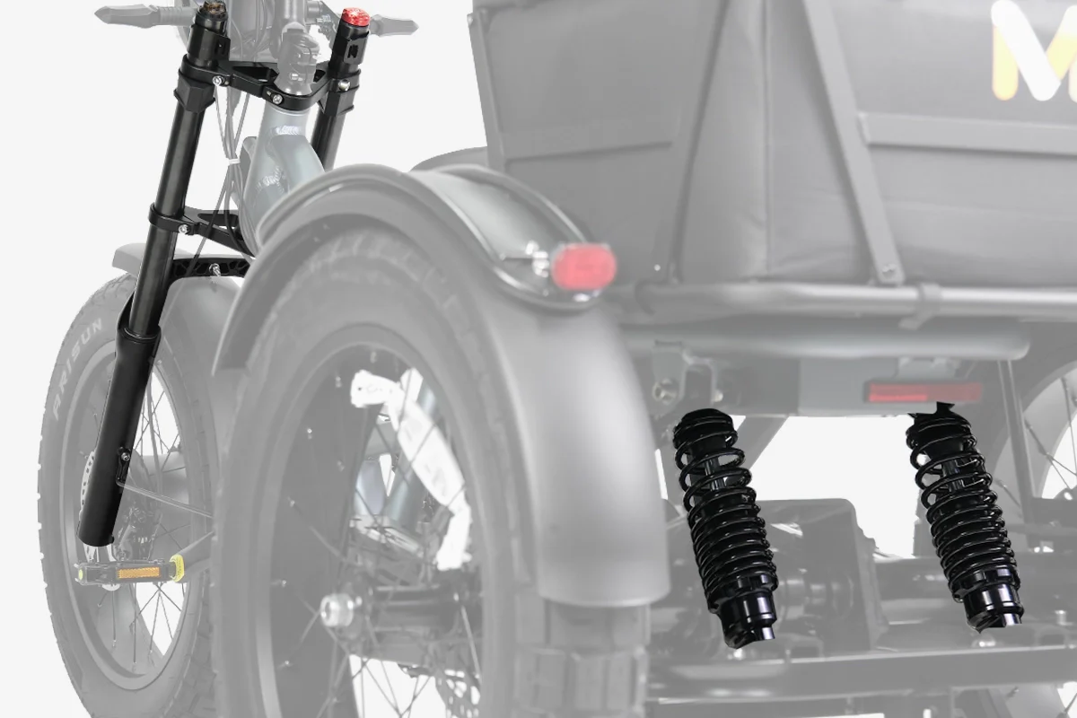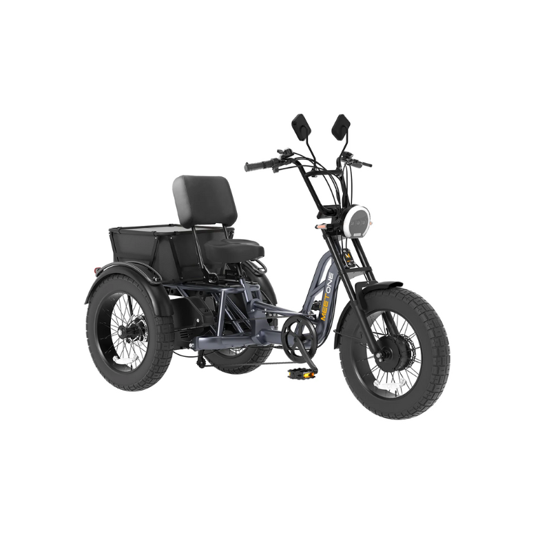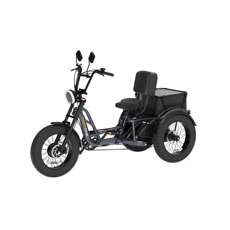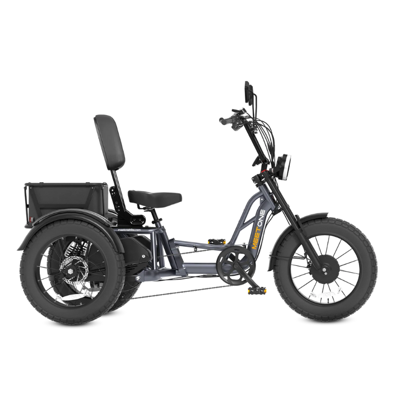 The Meet One Tour is a powerful, dual motor electric trike engineered for riders who value traction, control, and comfort. With all-wheel drive, hydraulic brakes, and a triple suspension system, it’s built to handle inclines, cargo, and longer rides—while offering an ergonomic semi-recumbent position with an adjustable backrest for all-day comfort.